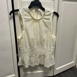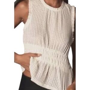 Chic sleeveless blouse with a textured pattern. Features a gathered waist and flared hem.