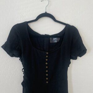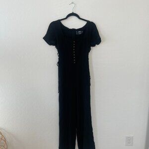 Wide Leg Color Black Square neck Lace Up Side + Metal detail. Somewhat adjustable as the lattices can be tightened. Faux Button Front Zipper Back Side Pockets 100%viscose