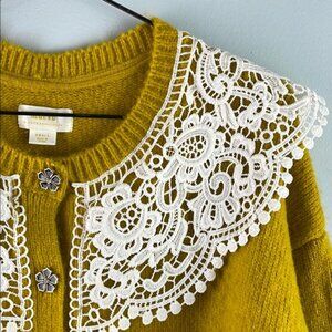 Anthropologie Maeve cropped cardigan sweater featuring a delicate lace collar and black enamel flower buttons. Size Medium