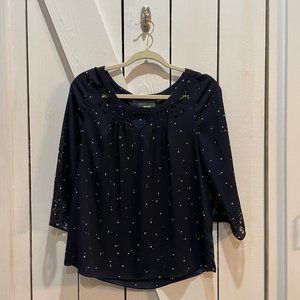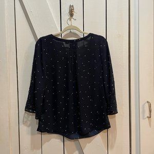 Maeve by Anthropologie navy and white semi sheer blouse. Star celestial print all over, with laser cut detailing on the collar and bell sleeves. Keyhole at the neckline. Gently used with no flaws, size 2. Approx. measurements laying flat: pit to pit 18" shoulder to hem 24.5"