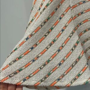 women's skirt featuring ivory back with tweed vibrant orange , metallic gold, and green stripes. Perfect for adding a pop of color to your wardrobe.