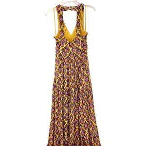Maeve by Anthro Halter Luella Maxi Dress in Yellow. Size small. Halter neckline. Leg slit. Pink, purple, orange and green print. Jersey like fabric. Lined. Excellent used condition.
