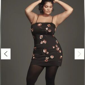 Stunning Maeve (Anthropologie) Brynne mini dress — new with tags in a size 8. Sleek spaghetti straps, body-conscious mini silhouette, and raised 3D floral appliqués that catch the light — perfect for date nights, parties, or cocktail events. Lower lining provides smooth coverage while the textured florals give luxe depth and a statement look.