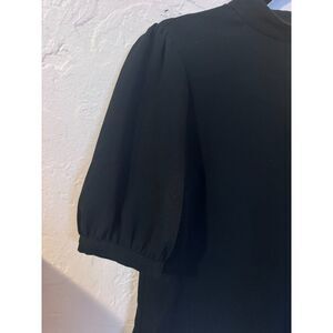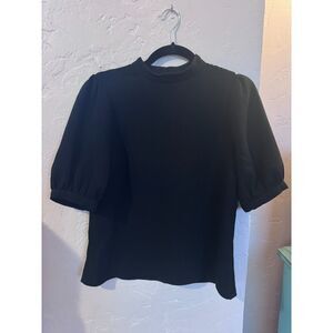 A classic black top with a twist. Black mock neck with puff sleeves. Buttons at the back of neck. Size 6. Relaxed fit.