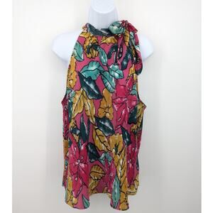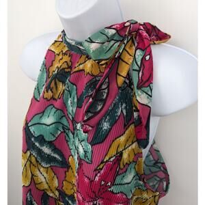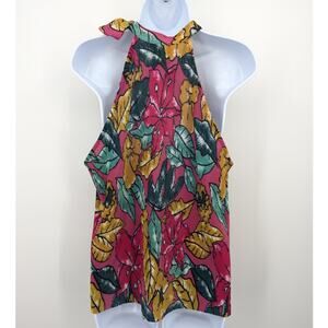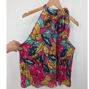 Maeve by Anthropologie Floral Pleated Halter Tank Large Top Tie Neck Tropical