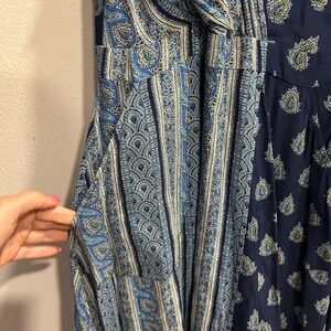 This Maeve dress from Anthropologie combines vibrant boho charm with a flattering silhouette. Featuring a mix of blue-toned paisley and geometric prints, it has a sleeveless wrap-style bodice, fitted waist, and a flowing handkerchief hem that adds movement and shape. Perfect for summer outings, casual dinners, or festivals.
