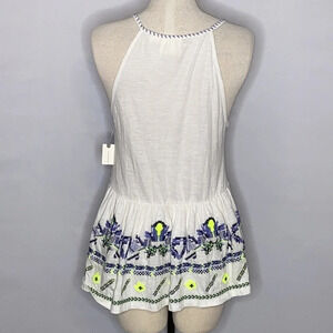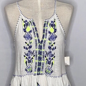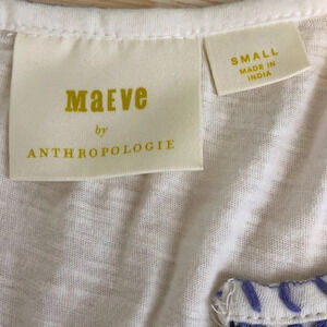Maeve by Anthropologie Neela Embroidered Babydoll Top - Size Small. New with tags. With that said, the price tag has caused a tiny pinhole underneath the left armpit area. I have priced accordingly and it would just take a simple stitch or two to mend it. Cotton, Embroidered detail, V-neck, Babydoll silhouette, Pullover styling. Approximate measurements: 16" bust, 27" length.
