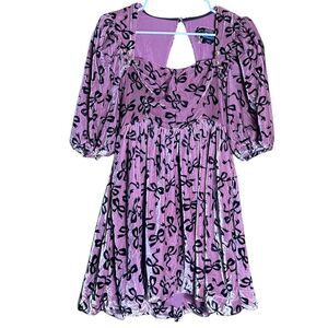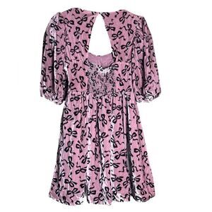 This Playful Fit and Flare Mini Dress Features a Vibrant Pink and Black Bow Pattern. The Romantic Puff Sleeves and Sweetheart Neckline Enhance its Feminine Charm, Making it an Ideal Choice For a Cocktail Night Out.