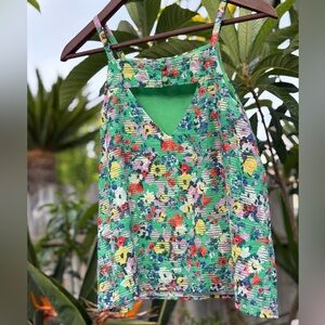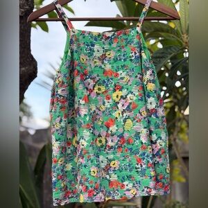 Vibrant floral sleeveless top with a green lined base, and a textured floral semi sheer stripes throughout blouse. Perfect for a casual day out.