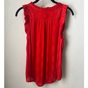 Maeve by Anthropologie sleeveless ruffle button-up top in size Medium Petite. A soft, feminine piece featuring a high/low hem that adds movement and a flattering silhouette. The ruffle trim along the button placket brings a romantic touch, perfect for styling with trousers or jeans. Lightweight and versatile, ideal for spring and summer wear.