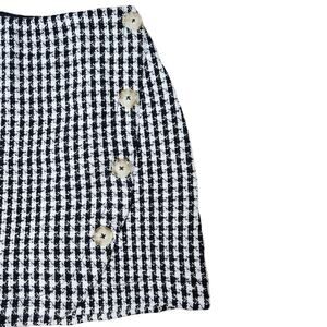 Black and white houndstooth mini skirt from Maeve for Anthropologie. Faux wrap with buttons (buttons are not designed to be operational) Slight stretch (note NO stretch at waistband). Lined