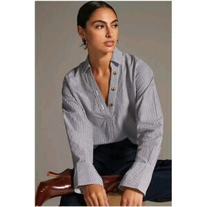 Maeve by Anthropologie Striped Henley Popover Shirt, Size Small. Excellent pre-loved condition. No stains, holes, tears or defects. The perfect career-wear to dinner to weekend shirt. Color: Navy/ White