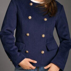 Elevate your style with this elegant navy jacket featuring striking gold buttons. The hooded layer is removable if you want to wear just the peacoat. The material for the coat is 100% polyester, and the hooded layer is 100% cotton.