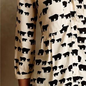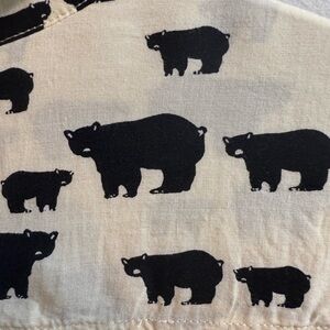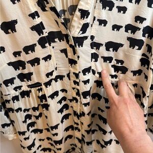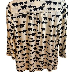 This chic blouse showcases a striking black bear silhouette pattern on a clean cream backdrop. The 3/4 sleeves and mandarin collar add a touch of elegance, making it a versatile piece for any wardrobe.