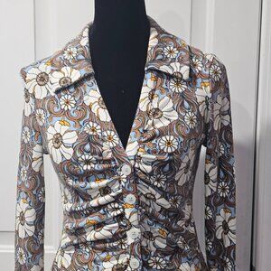 This image shows a long sleeve blouse with a 70s-style floral pattern in blue, brown, and white. The blouse has a V-neck with a collar, a ruched front with buttons, and a fitted silhouette.