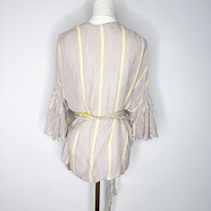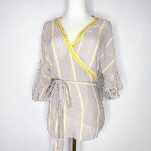 Keywords: Maeve wrap blouse, Anthropologie top, Visby wrap, boho blouse, striped tie waist top, small Maeve shirt, ruffle sleeve blouse, summer wrap top, feminine stripe shirt, resort wear