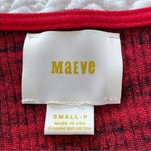 Maeve for Anthropolgie "Arete" red ribbed knit midi dress. Dress is a true blue red with black space dye detailing. It's a pullover with V neck front. Dress is made of a soft stretchy rayon, poly, spandex blend and is a woman's size 4.
