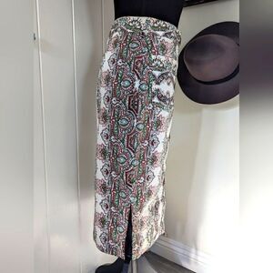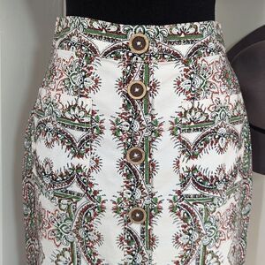 Description: Maeve Anthropologie Kaleidoscope Button Front Pencil Front Button Preppy Academia Coastal Classic Skirt 0, concealed back zipper, fabric has some stretch to it, wooden button front detail, two side slits, two top slip pockets, spare button included