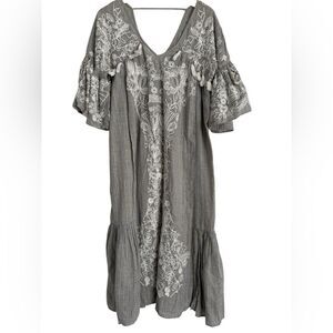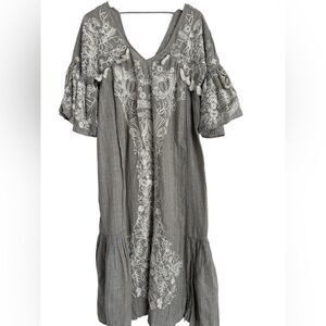 Chic gray dress with delicate white floral embroidery. Ideal for stylish outings. In excellent condition. Armpit to armpit, 22 inches. Length 43”. Does not have the shell. I wore it without for more comfort.