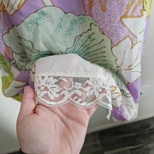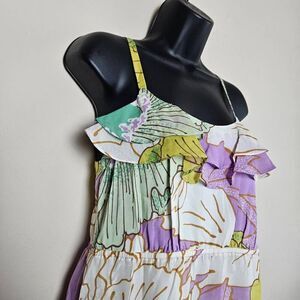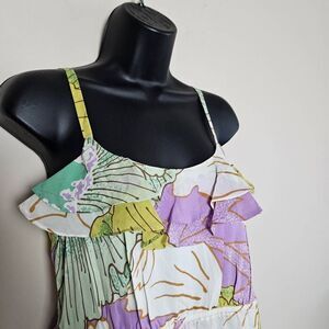 This is the Aqueous Grove slip dress by Maeve, an Anthropologie brand. It has adjustable straps and a ruffled bustline. This dress has purple, white, yellow, and green floral print with a solid white lining underneath. The lining has lace detailing. Note this dress was originally sold with a blue belt that is not included here.
