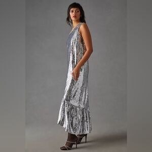The BY ANTHROPOLOGIE’s Maeve One-Shoulder Sequin Dress is ready to flaunt what you got, all night long! Plain fabric is accented with an allover sparkling sequins as it shapes this cocktail dress with an asymmetric neckline, one-shoulder style, and a sleeveless bodice. A relaxed silhouette drapes down to a skirt that ends at a midi tiered hem. Pullover styling Pair this stunning dress with the matching platform heels and a clutch to get plenty of complements throughout the night!