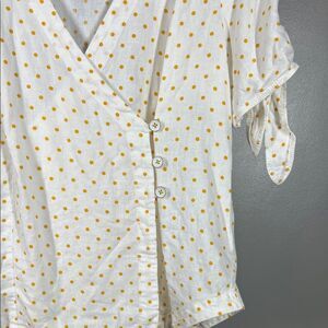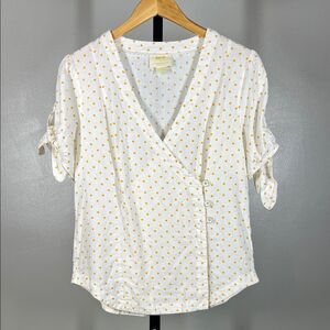 Chic blouse with playful yellow polka dots. Features a stylish wrap design. Perfect for any occasion.