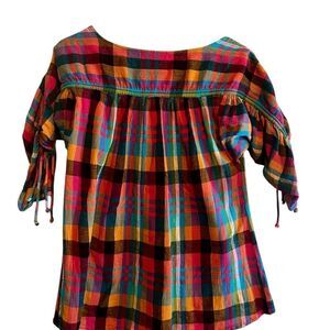Oversized chic blouse. 100% gauzy cotton, v neck, vibrant colors, tie sleeves. Size: XS but fits like a small or medium. Pit to pit: 23”, length: 22-24”. Great condition