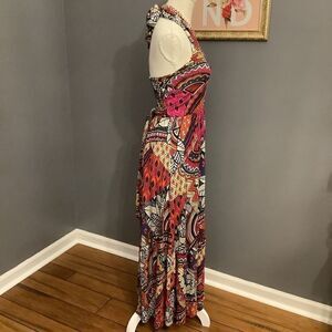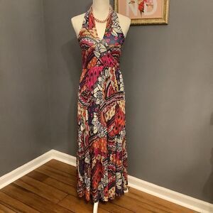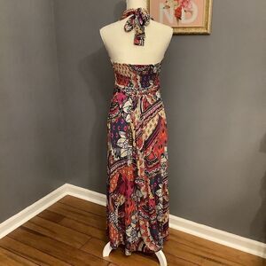 Gorgeous, brilliant color and design, halter tied maxi dress. Bodice has elastic so there is some good stretch. Rayon spandex. Fully lined. Nice quality. Size XS.