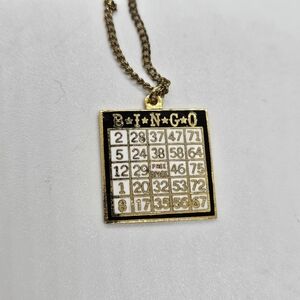 Short gold tone chain necklace with a square enamel pendant of a bingo card. Has light tarnishing on the chain, but in otherwise good condition. Quarter shown for scale, will not be included with your order. Chain is approximately 16"