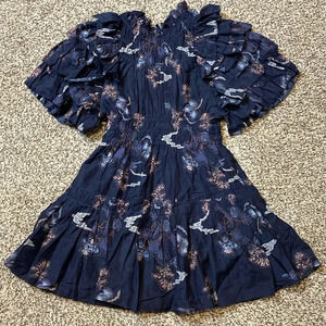 Size Petite Medium. Could fit small too. Pit to pit 15”. Waist 13” (smocked with stretch). Shoulder to hem 33”. Lightweight cotton silk blend. Lined. work of art dress.