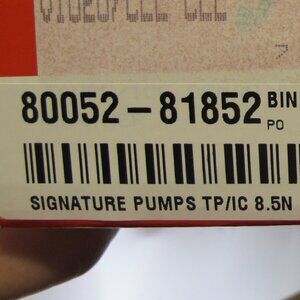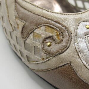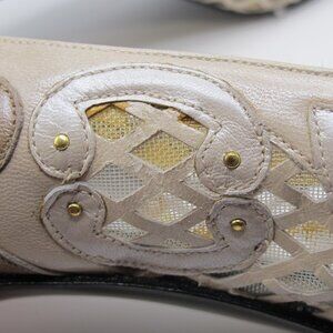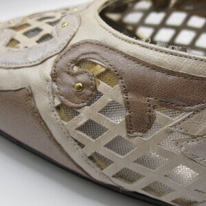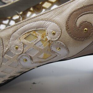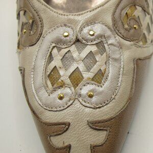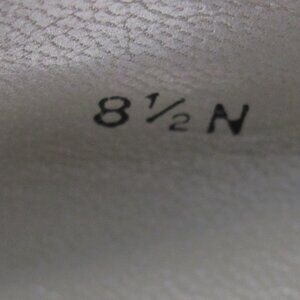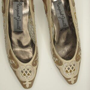 Magaret Jerrold 2 inch brown and bone fancy heels in 8.5N. These have highly detailed leather-work scrolls and lattice with mesh underlay. Toe, heel and some scrolls are taupe, the sides are bone. There are some yellowed areas in the mesh (mostly on left shoe) – it looks like adhesive bleed and discoloring from storage. See photos for details. Appears to never have been worn. **Sole grip was added, but one can see the heel and rest of sole has no wear. Adding grips was a common practice of Mom when buying heels.**