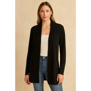 Experience effortless luxury with this Magaschoni 100% Cashmere Open-Front Cardigan. Crafted from ultra-soft, premium cashmere, this timeless black cardigan drapes beautifully and feels incredibly cozy — the ultimate layering piece for refined, year-round style.