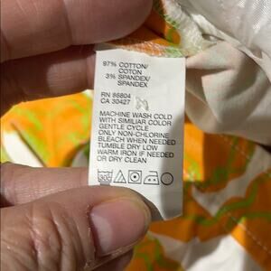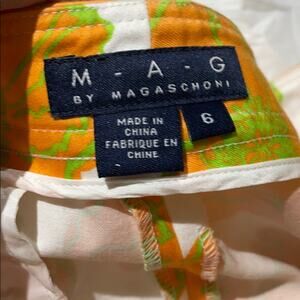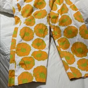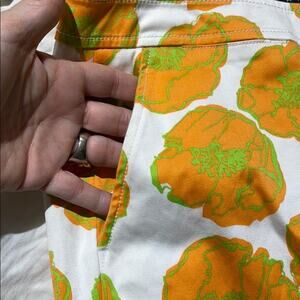 Magaschoni 6 white with orange and touch of lime green repeating floral pattern Capri . Flat front, side entry flat pockets, wider straight leg style, 24” inseam and super flattering on. EUC