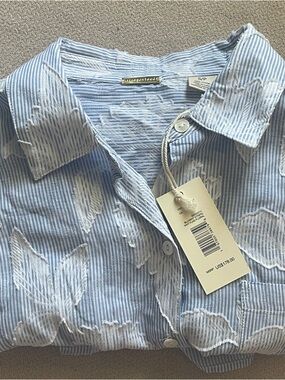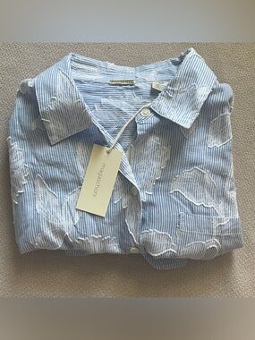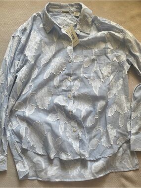 Elegant blue blouse with floral pattern. Button-down front. Long sleeves. Perfect for any occasion.