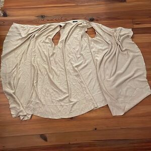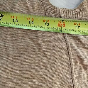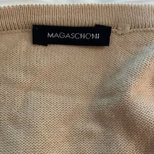 Beige, tan, knit open cardigan, long line sweater vest by Magaschoni. The size tag has been cut. I had two size S/M ladies try it on and it fit both of them. We think it would best fit a size small but look at the approximate measurements to determine your fit. The width of the sweater is plenty big but the armholes seem to be on the smaller side. There is enough of the tag to see the top is 45% cotton. The sweater is very soft so it might be a viscose and/or cashmere blend. Hand washable. In very good pre-owned condition with minor sign of wear from normal use. cotton, lagenlook, casual, layering, flowy, fall