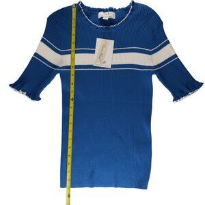 Magaschoni Blue White Stretchy Rib Knit Top Med Ruffle Edge Neck & Sleeves NWT