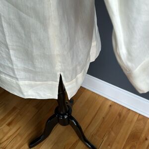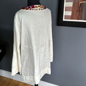 Magaschoni Collection off white linen/polyester blend jewel tone beads/crystal neckline tunic. Fabric from France. Center front slit with hook eye closure. Sideseam hem slits. Invisible sideseam zipper. Size 12. Like new. Nonsmoking home.
