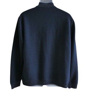 Magaschoni Man Full Zip Bomber Sweater Jacket. Dark Navy Horizontal Ribbed Knit. Snap Pockets. Machine Wash Cotton Poly Blend. Tagged Size L.