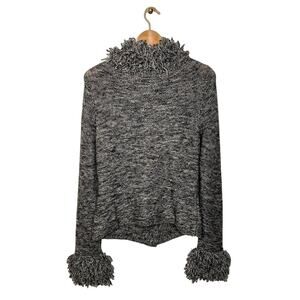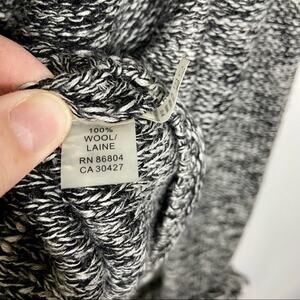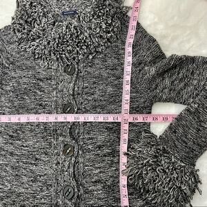 Super soft 100% wool cardigan sweater by Magaschoni in very good preowned condition. The color is marled black and white that reads gray. It has lots of fringe on the neck and wrists. Button closure with two eyelet closures at the neck. The size tag is missing but measurements are consistent with a size small. See photos for measurements.