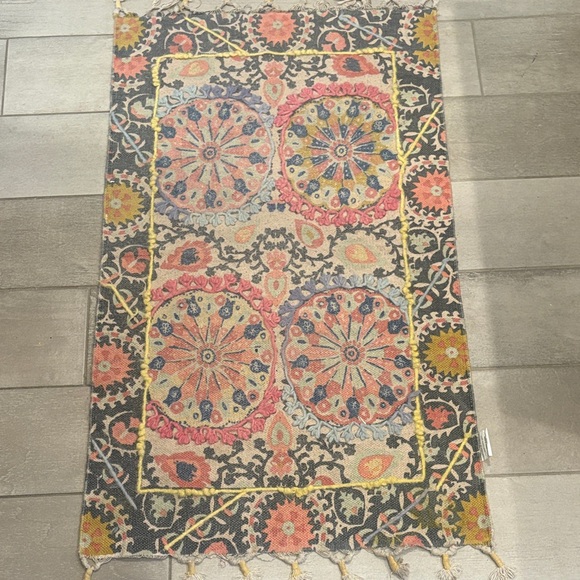Vibrant rug with intricate floral patterns. Features circular designs and tassel edges. Perfect for adding color to any room.
