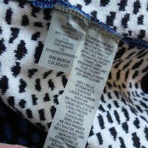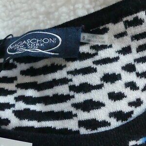 brand new Magaschoni New York,Saltwater blue Combo Knit Dress in USA Size Small. This fit and flare dress falls at the knee, it is a knit that has a fabric combination of: 70% Silk, 17% Nylon, 11% Cashmere & 2% spandes. Slight stretch in a beautiful shades of blue with white and black geometric type pattern.