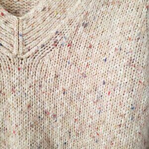 Design: Features a V-neck, long sleeves, and a chunky knit with a confetti-like pattern of multicolored specks on a neutral beige base. Ribbed cuffs and hem.