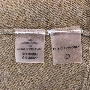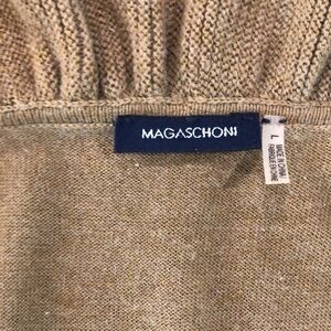 Magaschoni cashmere blend ruffle front long sweater. Warm olive green ( color appears more gray in photos). Two hook and eye closures. Ruffle runs from behind the neck, around the hem and up the front. Long sleeves have rolled hems. Size L. Back measurement from pit to pit is 19”. Length from shoulder to hem is 35”. Pre-loved with minor pilling.