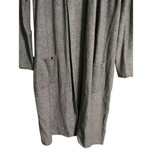 Lightweight, soft gray cardigan with ribbed knit texture. Features long sleeves, open front, and front pockets. Long length. Made of viscose, polyester, and nylon for comfort and durability.
