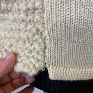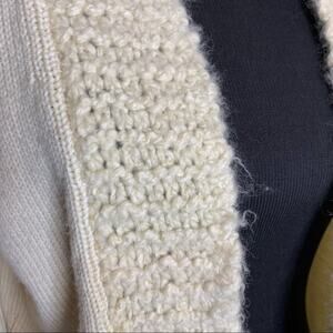 Magaschoni cream open front camel hair trim cardigan. Open front with crochet trim at neckline, down the front and on the sleeve cuffs. Size Medium. Good preowned condition. A few tiny untreated spots as shown. Stitching on side seams is slightly coming undone. Some minor fuzzing - normal with wool. 100% wool cardigan. Trim is 60% wool 37% camel 2% nylon 1% spandex.