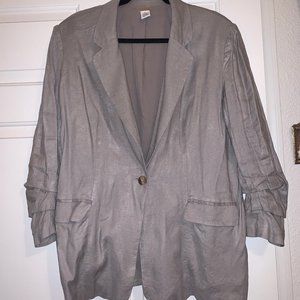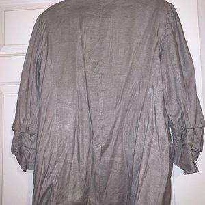 Grey linen blazer with cropped ruffle sleeves. Size L but fits more like XL. Worn maybe 6 times but it;'s just too big. 100% linen so wrinkles easily.