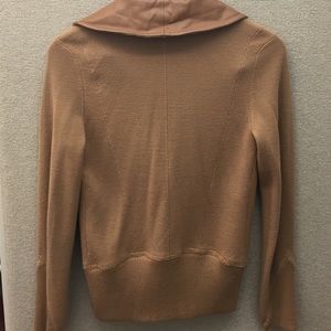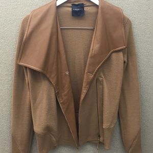 Magaschoni wool sweater jacket in camel color. Faux leather lapel. Ribbing detail on the sleeve and at the waist. Asymmetrical zipper. 100% wool.