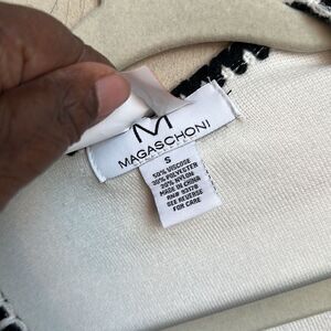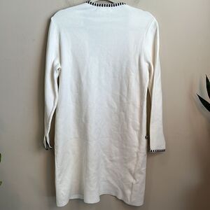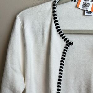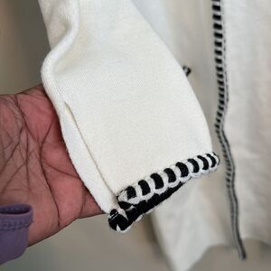White sweater trimmed in black with pockets. Slits in sleeve
