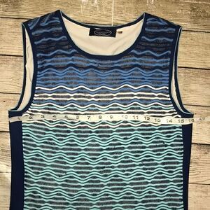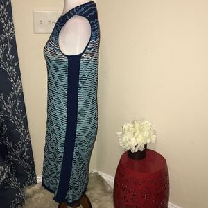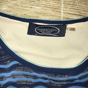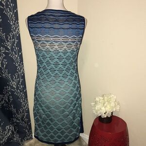 Good, preloved condition. Magaschoni Sleeveless Illusion Sheath Dress. Shades of blue, turquoise, and white. Patterned wavy lines. Woven material with some small pulls. No stains. Shell: 56% cotton, 44% rayon. Lining: 100% polyester.