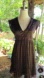 Women's 100% silk brown midi dress with v-neck bodice, cap sleeves, pleated lower with crochet hem, and tie accent at rear waist.